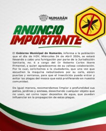 Numaran, Michoacàn a 24 de Abril del 2024.-Les informamos a la población, que el día de HOY por la tarde/noche, se estará llevando a cabo, de nueva cuenta, una fumigación por parte de la Jurisdicción Sanitaria no. 6. Recordándoles que es importante que sigan cada una de las...