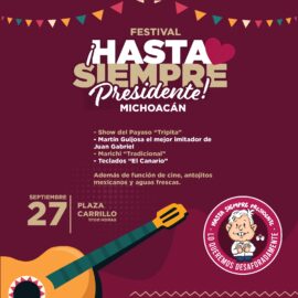 Morelia, Michoacán, a 25 de Septiembre de 2024.- A unos días de terminar el sexenio del presidente Andrés Manuel López Obrador, el vicepresidente del Congreso del Estado, Juan Carlos Barragán invita al festival “Hasta Siempre Presidente”, el próximo viernes 27 de septiembre en la plaza Carrillo a partir...
