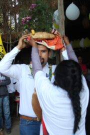 Zitácuaro, Michoacán a 18 de mayo de 2021. Con la tradicional cuelga de pan, habitantes de la comunidad indígena de Nicolás Romero, Toma de Agua, recibieron al candidato a Diputado Federal de la alianza Va por México, Octavio Ocampo Córdova, como una muestra de aprecio y reconocimiento a...