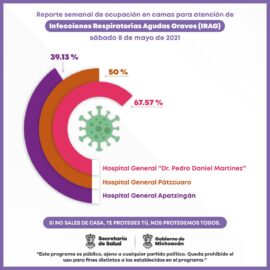 Morelia, Michoacán, a 8 de mayo de 2021.- De los hospitales de la Secretaría de Salud de Michoacán (SSM) con camas reconvertidas para la atención de Infecciones Respiratorias Agudas Graves (IRAG), tres son los que registran mayor ocupación. Con el 67.57 por ciento, el Hospital General “Pedro Daniel...