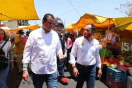 Morelia, Michoacán, a 3 de mayo de 2021.- Memo Valencia, candidato del PRI a la Presidencia Municipal de la capital michoacana recorrió el tianguis de la colonia Prados Verdes, acompañado por Carlos Herrera Tello, candidato a la gubernatura de Michoacán por el Revolucionario Institucional. Ahí encontraron a morelianos...