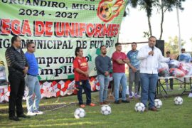 Puruándiro, Michoacàn a 03 de Octubre 2024. Reunidos en la Unidad Deportiva Benito Juárez de la cabecera municipal, los 70 equipos que conforman la Liga Municipal de Fútbol, recibieron de manos del Presidente Municipal, Víctor Manuel Vázquez Tapia, uniformes deportivos cumpliendo así con el compromiso hecho a petición de...