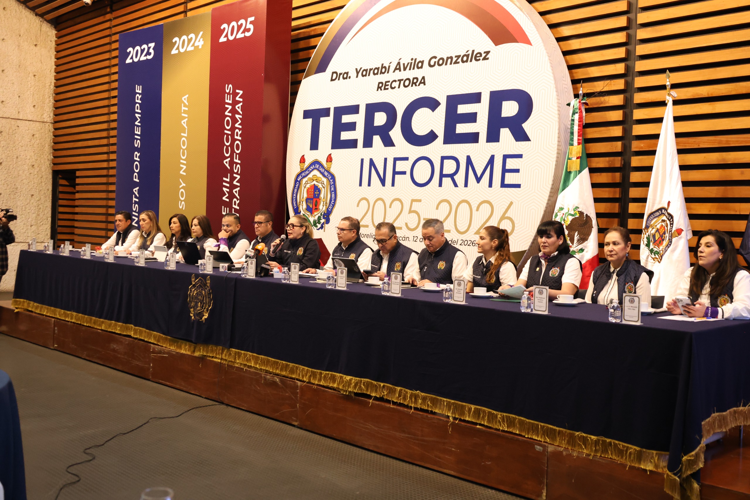 Durante la rueda de prensa, la rectora y titulares de diversas áreas de la casa de estudios compartieron las acciones realizadas en el año 2025, destacando la profunda reforma al marco normativo de la Universidad Michoacana de San Nicolás de Hidalgo (UMSNH).