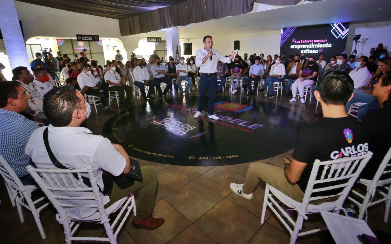 Zamora, Michoacán, a 18 de mayo de 2021.- Fue en Zamora donde Carlos Herrera Tello se comprometió a regresarle el Instituto del Emprendedor a los jóvenes michoacanos para encender la chispa emprendedora y propiciar que instalen su propio negocio.