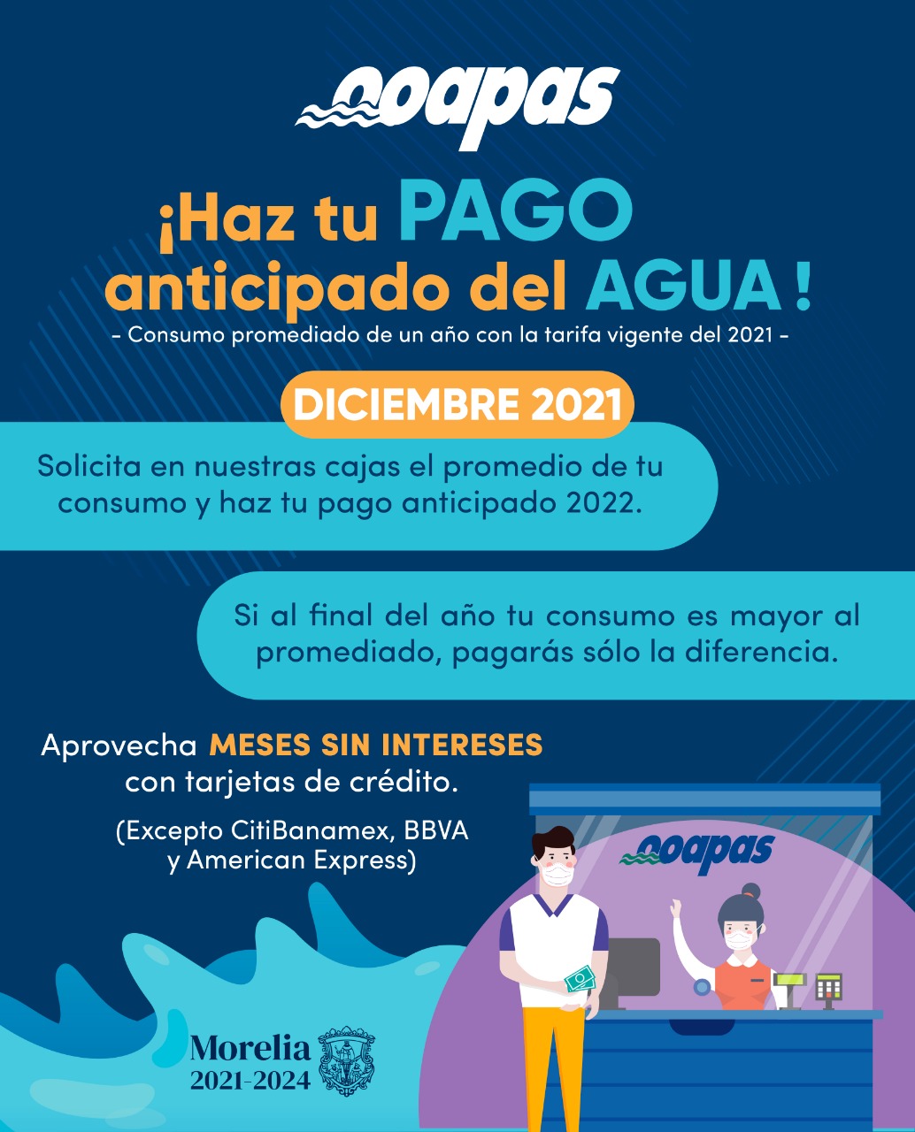 Morelia, Michoacán a 12 de Diciembre de 2021.- A partir de este lunes 13 y durante todo el mes de diciembre el Organismo Operador de Agua Potable, Alcantarillado y Saneamiento de Morelia (OOAPAS) iniciará su programa de Pago Anticipado, donde los usuarios podrán pagar su consumo promediado del año 2022 con la tarifa vigente del 2021.