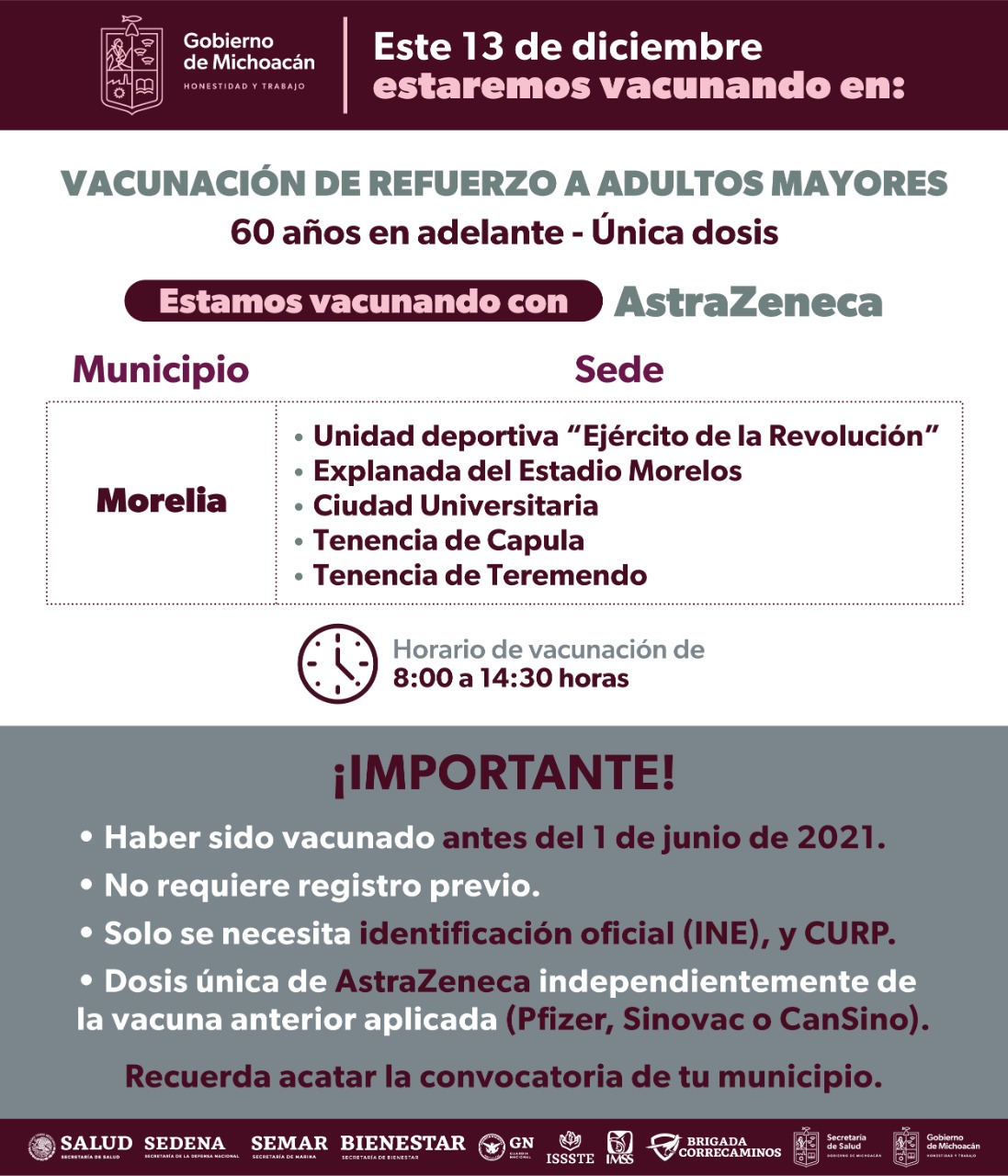 Morelia, Michoacán, a 12 de diciembre de 2021.- Este 13 y 14 de diciembre se extenderá vacunación de refuerzo anti COVID-19 para adultos mayores de 60 años y más en Morelia, para lo cual se instalarán cinco sedes.