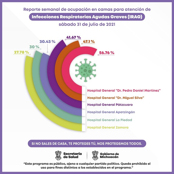 Morelia, Michoacán, a 31 de Julio de 2021.- De las unidades médicas de la Secretaría de Salud de Michoacán (SSM) con camas reconvertidas para la atención de Infecciones Respiratorias Agudas Graves (IRAG), los hospitales de Uruapan, Morelia y Pátzcuaro son los que registran mayor demanda.