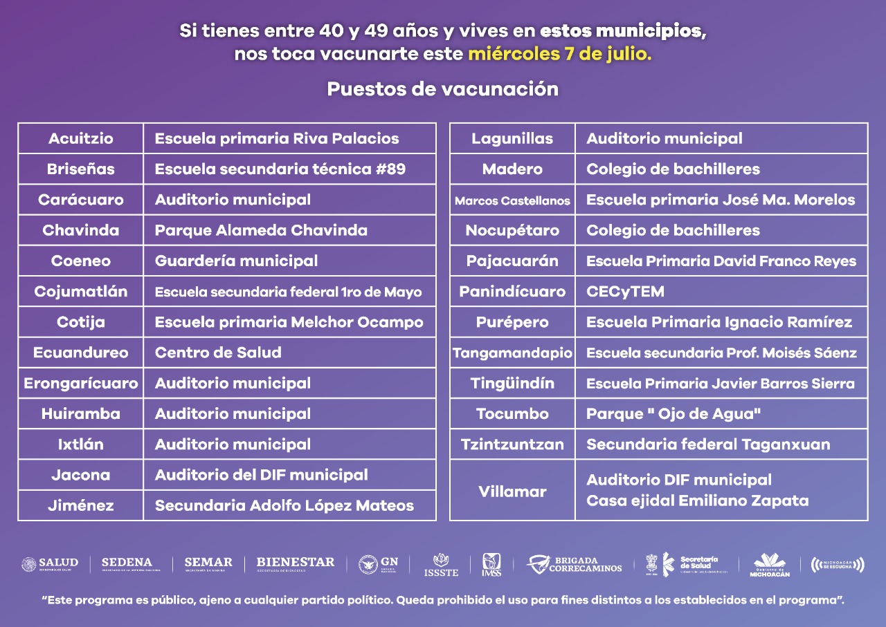 También se instarán puestos de inmunización para personas de 40 a 49 años en Acuitzio, Briseñas, Carácuaro, Chavinda, Coeneo, Cojumatlán, Cotija, Ecuandureo, Erongarícuaro, Huiramba, Ixtlán, Jacona, Jiménez, Lagunillas, Madero, Marcos Castellanos, Nocupétaro, Pajacuarán, Panindícuaro, Tangamandapio, Tocumbo, Tzintzuntzan y Villamar.