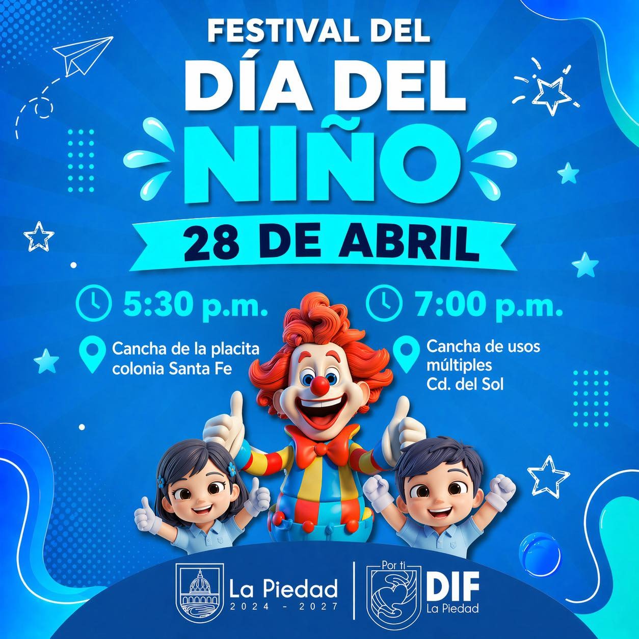 El Festival del Día del Niño, comenzará este martes 28 en la cancha deportiva de la colonia Santa Fe a partir de las 17:30 horas, posteriormente a las 19:00 horas daremos continuidad a la celebración en la cancha de usos múltiples de la colonia Ciudad del Sol.