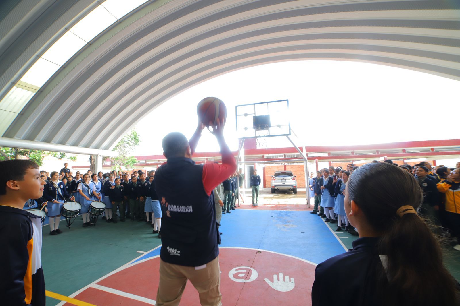 Morelia, Michoacán, a 8 de septiembre de 2025.- El diputado local y líder social Juan Carlos Barragán entregó la rehabilitación de la cancha de básquetbol de la Secundaria Federal No. 1 “José María Morelos”, como parte del programa Échale una Mano a las Escuelas, iniciativa que ya suma 900 espacios educativos atendidos en Morelia.