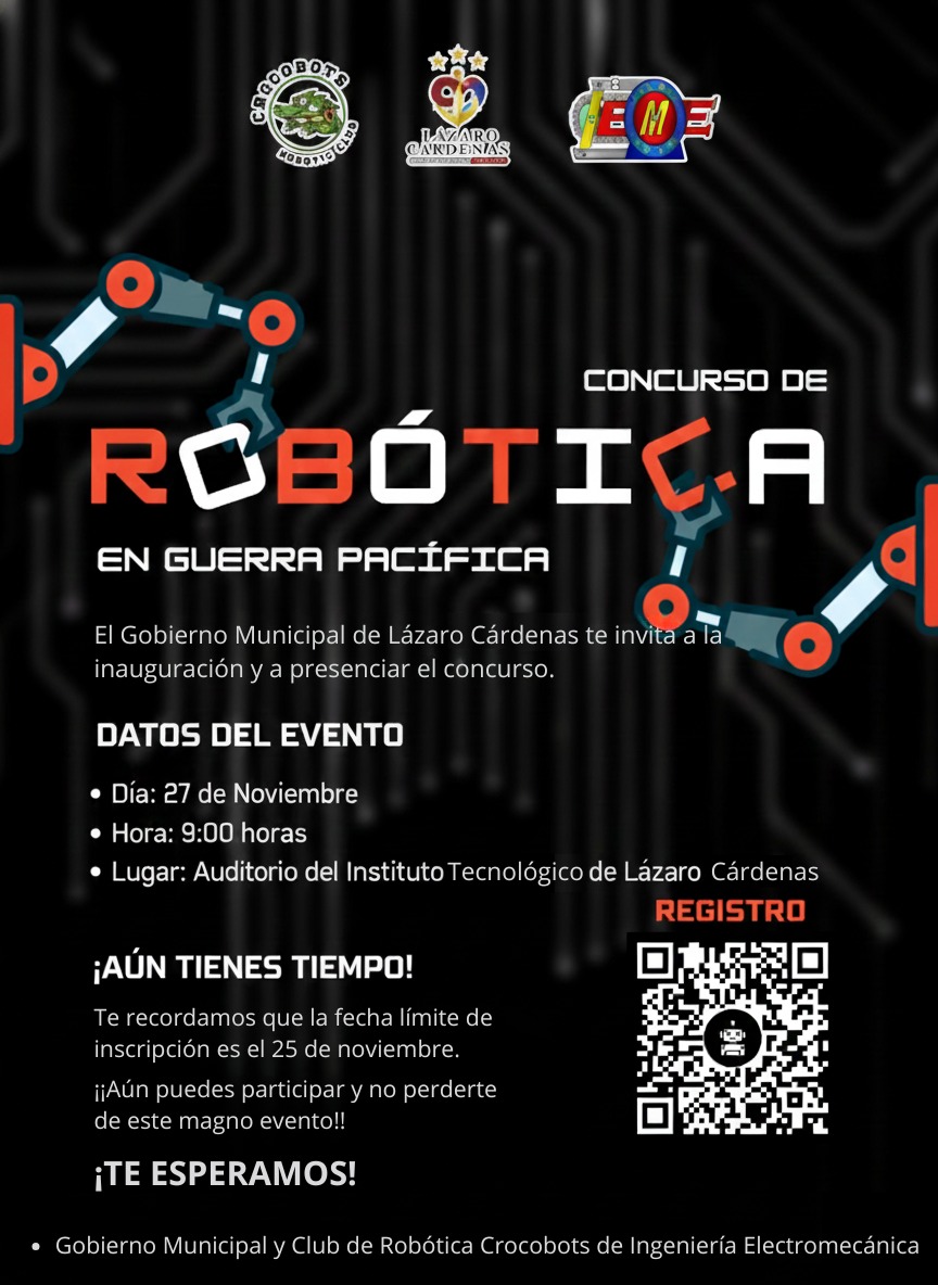 Cd. Lázaro Cárdenas, Michoacàn a 21 de noviembre de 2025.– A tan solo unos días de su realización, Lázaro Cárdenas se encuentra listo para recibir a los participantes en el Concurso de Robótica “En Guerra Pacífica”, un evento que marca un momento importante para la región y que será albergado en el Auditorio del Instituto Tecnológico de Lázaro Cárdenas el próximo 27 de noviembre a las 9:00 horas.
