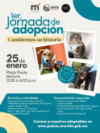 Morelia, Michoacán, a 23 de enero de 2026.- El Gobierno de Morelia, a través del Instituto Municipal de Protección Animal (IMPA), invita a la ciudadanía a participar en la Primera Jornada de Adopción bajo el lema “Cambiemos su historia”, que se llevará a cabo el próximo 25 de...