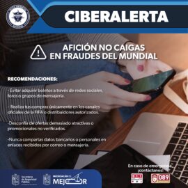 Morelia, Michoacán, 24 de septiembre de 2025.- A través de labores de cibervigilancia efectuadas por elementos de la Secretaría de Seguridad Pública (SSP), se descubrieron distintas modalidades de fraudes alusivas a la venta de boletos del Mundial de Fútbol a realizarse en México en el año 2026. A...