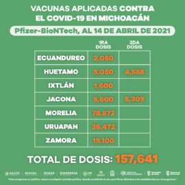 Morelia, Michoacán, a 14 de abril de 2021.- La Secretaría de Salud de Michoacán (SSM), informa que ha aplicado 418 mil 823 dosis de vacuna anti COVID-19 a adultos mayores de 60 años con el objetivo de protegerlos de este virus. En el caso de las personas que...