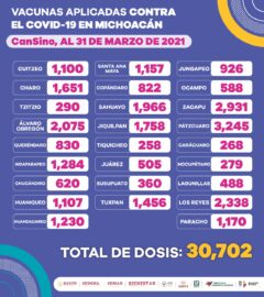 Morelia, Michoacán, a 31 de marzo de 2021.- Continúa con éxito la primera jornada de inmunización anti COVID-19 en Michoacán, dirigida a adultos mayores de 60 años, donde hasta el momento se han aplicado 281 mil 250 dosis en 64 municipios. Del total del biológico 30 mil 702...