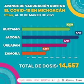 Morelia, Michoacán, a 10 de marzo de 2021.- La Secretaría de Salud de Michoacán (SSM), informa que 51 mil 69 adultos mayores de 60 años han recibido la primera dosis de la vacuna contra el COVID-19 en la entidad. Lo anterior, en los municipios de Villamar, Tingambato, Buenavista,...