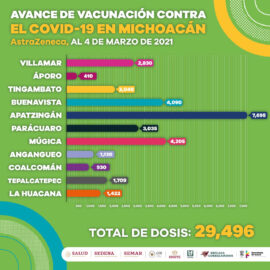 Morelia, Michoacán, a 4 de marzo de 2021.- En 13 municipios del estado se han aplicado 36 mil 981 primeras dosis de la vacuna contra COVID-19 a adultos mayores de 60 años, informó la Secretaría de Salud de Michoacán (SSM). La jornada se realiza de manera simultánea en Villamar,...