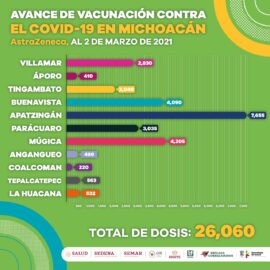 Morelia, Michoacán, a 2 de marzo de 2021.- La Secretaría de Salud de Michoacán (SSM), informa que 32 mil 370 adultos mayores han recibido la primera dosis de vacuna contra el COVID-19 en 13 municipios de la entidad. El personal de enfermería, médico y paramédico ha sido desplegado...