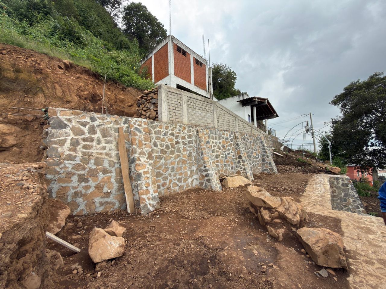Puntualizó que la obra consistió en la construcción de tres muros de contención, conformados con mampostería de piedra con una longitud total de 34.69 metros lineales, la cual cuenta con escalones y andadores. Para ello, la SCOP efectuó trabajos de demolición de rocas y relleno con material producto de excavaciones.