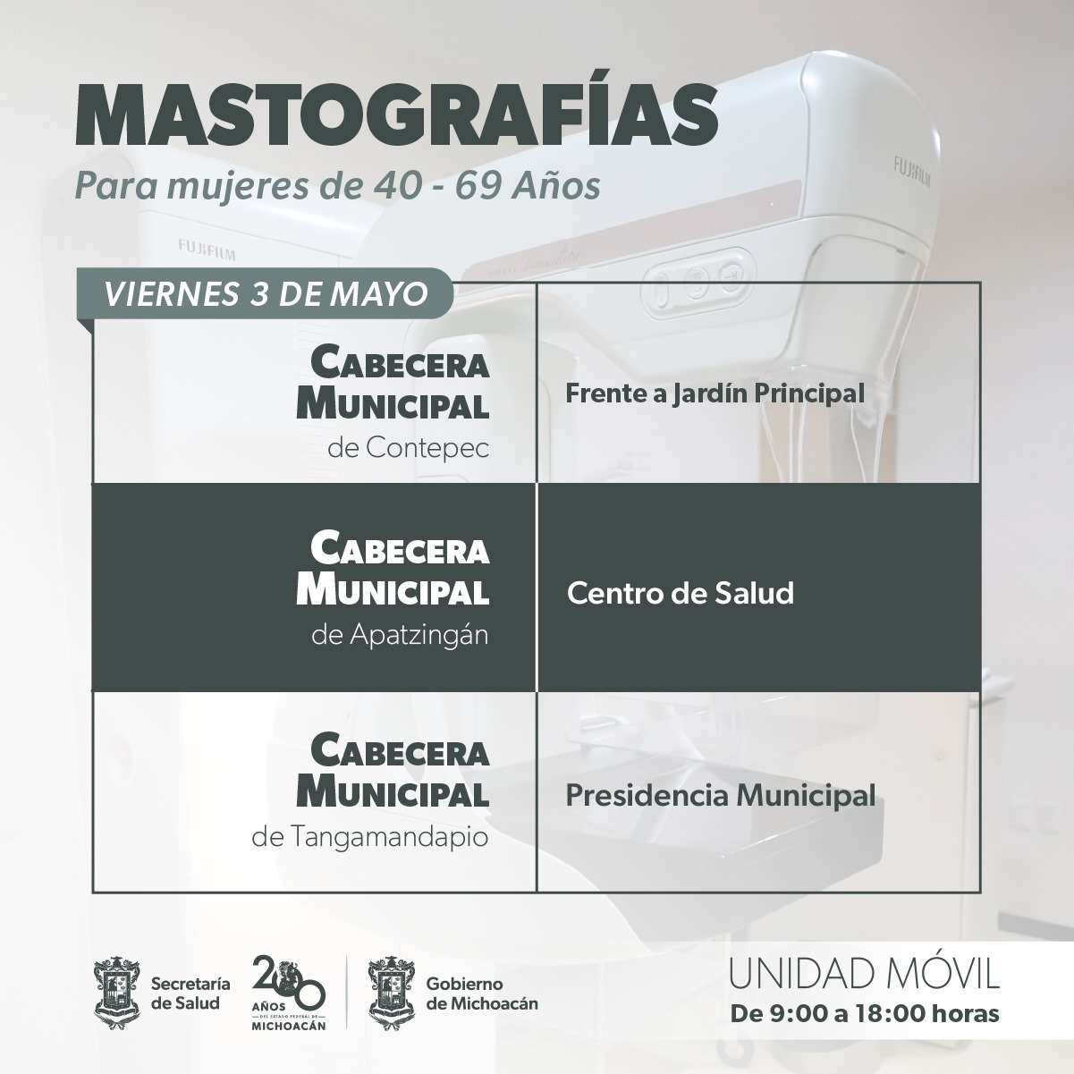 El martes 30 continuarán los estudios en el jardín de Tlalpujahua y la unidad médica de Antúnez, además de una jornada en la plaza principal de la localidad Cantera de Tangamandapio. El miércoles 1 de mayo solo habrá mastografías en el centro de salud de Antúnez.