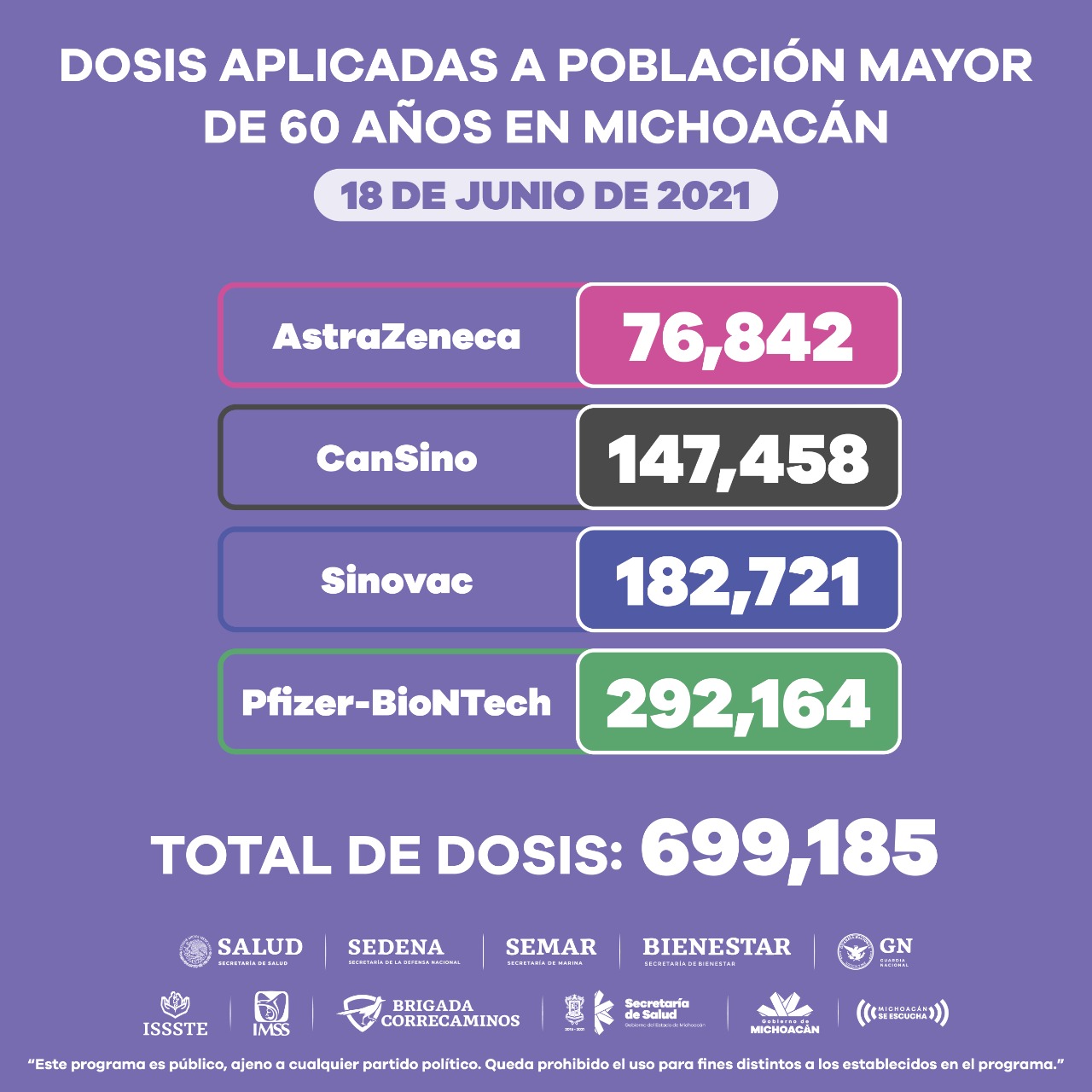 A las personas mayores de 60 años, se han aplicado 699 mil 185 dosis de AstraZeneca (76 mil 842), CanSino (147 mil 458), Sinovac (182 mil 721) y Pfizer (292 mil 164).