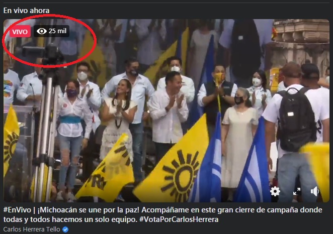 Morelia, Michoacán 1 de junio 2021.- Más de 25 mil personas siguen en vivo a través de la red social Facebook la transmisión del cierre de campaña de Carlos Herrera Tello, candidato de los partidos de la Revolución Democrática, Revolucionario Institucional y Acción Nacional al gobierno del estado de Michoacán. Con esto, desde el inicio del evento se marca un precedente en el uso de las nuevas tecnologías en las campañas políticas en la entidad.