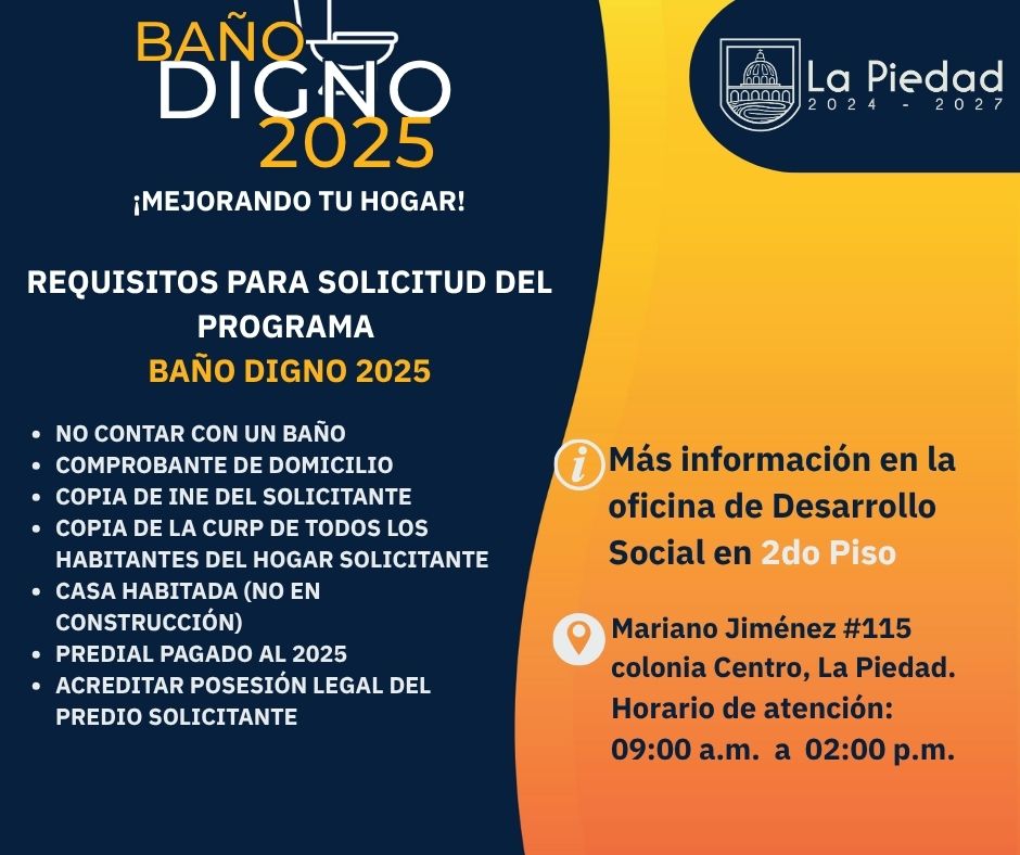Los requisitos para la solicitud de este programa son: no contar con un baño, comprobante de domicilio, copia del INE del solicitante, copia de la CURP de todos los habitantes del hogar solicitante, casa habitada que no en este en construcción, predial pagado al 2025, acreditar posesión legal del predio solicitante.