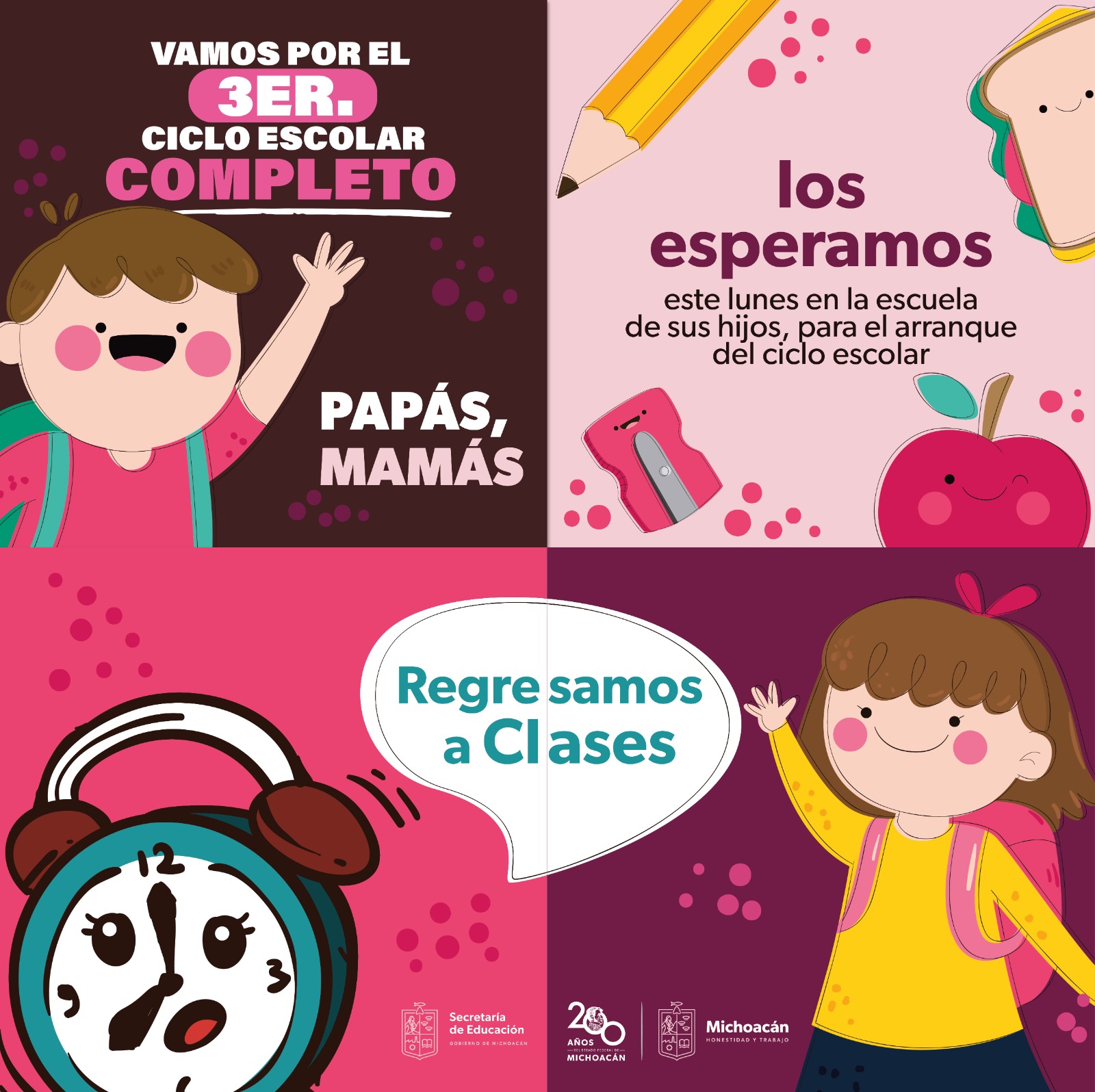 Morelia, Michoacán, 24 de agosto de 2024.- La Secretaría de Educación del Estado (SEE) hace un llamado a todos los padres y madres de familia a ir juntos por el tercer ciclo escolar completo, y se les invita a que acudan con sus hijos e hijas al arranque de ciclo 2024-2025 en las escuelas.
