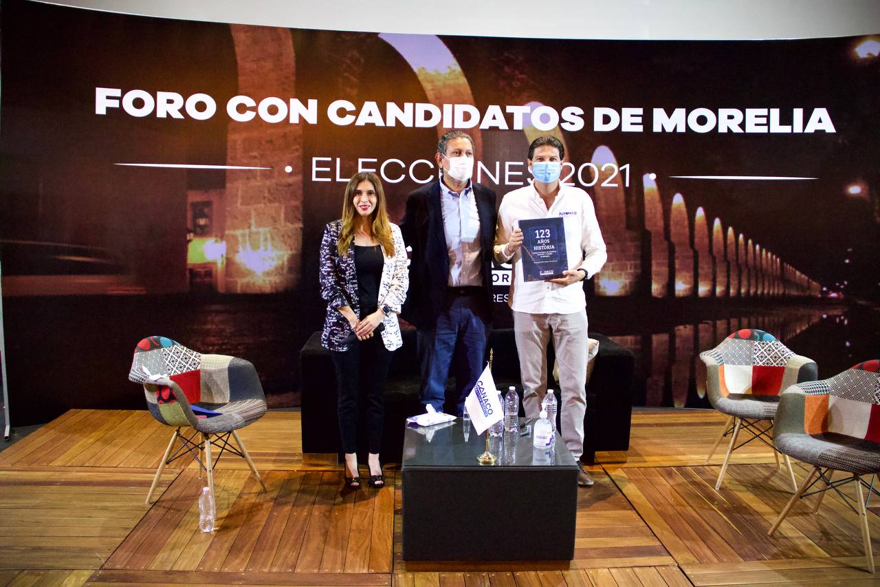 Morelia, Michoacán a 12 de mayo de 2021. .- El candidato a alcalde de Morelia, Alfonso Martínez Alcázar, presentó su plan de gobierno a empresarios de Canaco y sostuvo que la clave para el desarrollo de cualquier ciudad, es la seguridad, tema en el cual la actual administración ha quedado mucho a deber en virtud del incremento de la violencia y la consecuente caída en los índices turísticos, de inversión y empleo.
