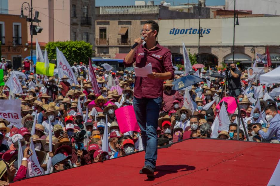 Morelia, Michoacán a 2 de Mayo de 2021.- «Este 6 de junio voto masivo a Morena», convocó Iván Pérez Negrón, candidato a la presidencia de Morelia, por la coalición «Juntos Haremos Historia», que conforma MORENA-PT, durante el arranque de campaña del candidato Alfredo Ramírez Bedolla a la gubernatura.